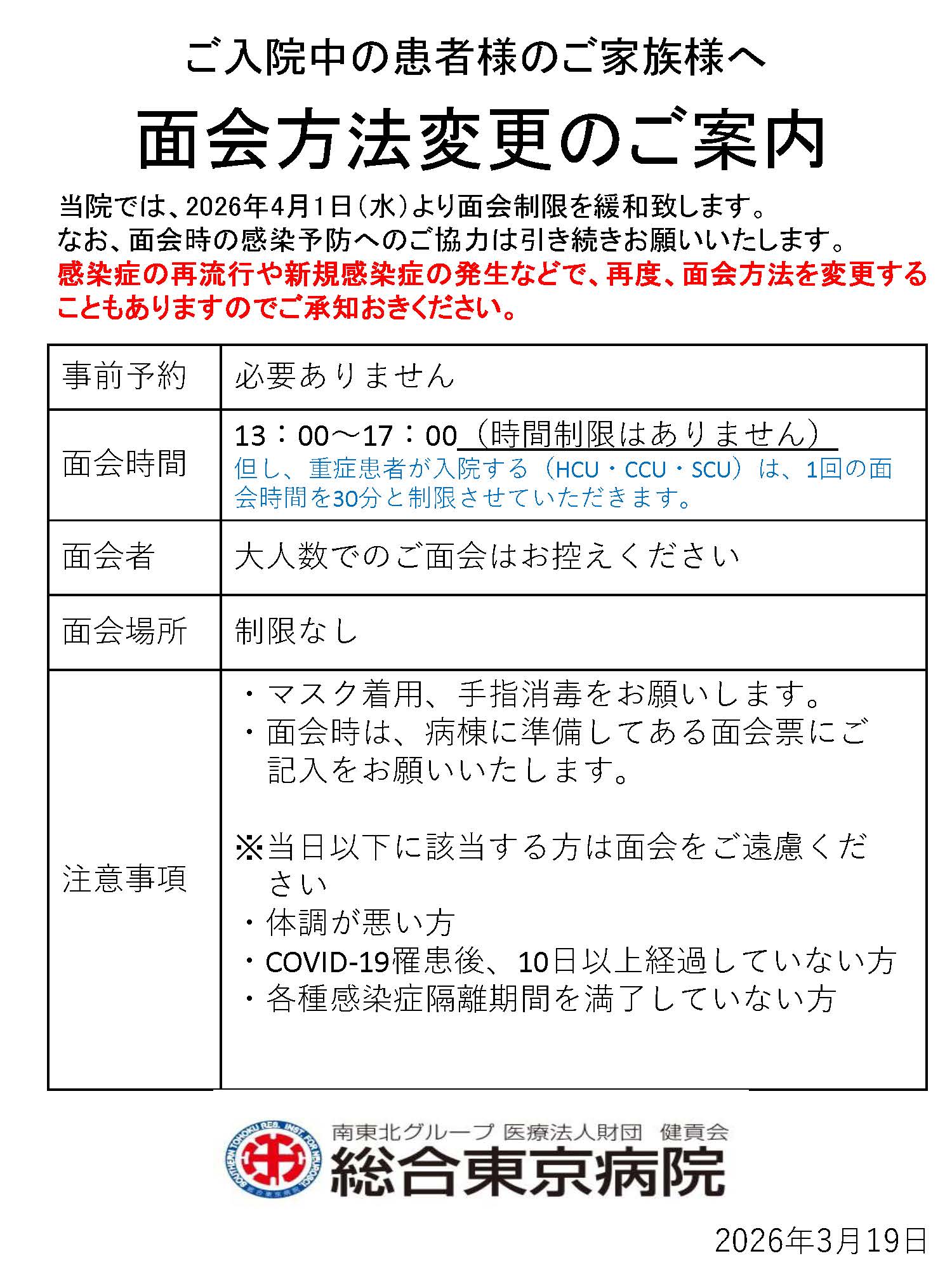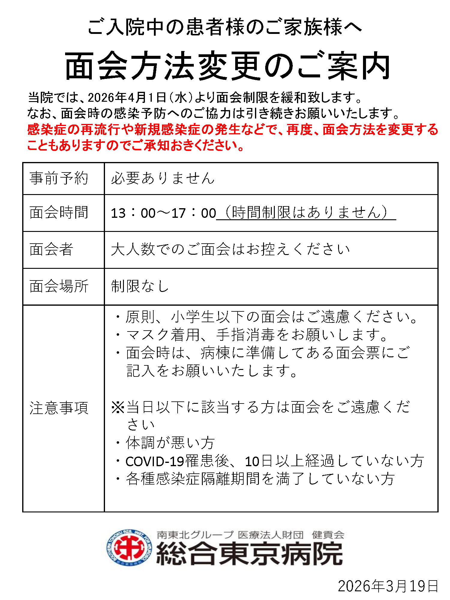 なお、面会時の感染予防へのご協力は引き続きお願いいたします。