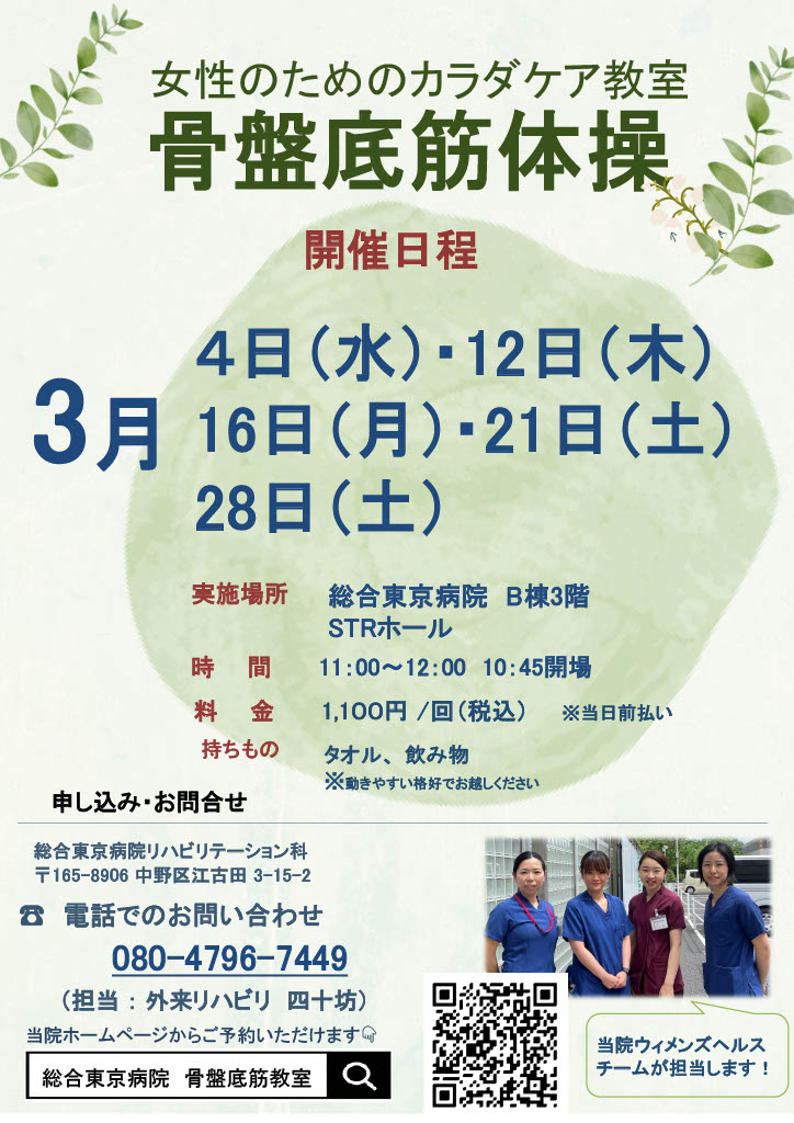 | 開催日程 | 3月4日(水)、3月12日(木)、3月16日(月)、3月21日(土)、3月28日(土) ※クラス分けはありませんので、初めての方もお気軽にお越しください。 ※既に満員となっている場合はご容赦ください。 ※医療保険での診療と同日に参加することはできません。 |